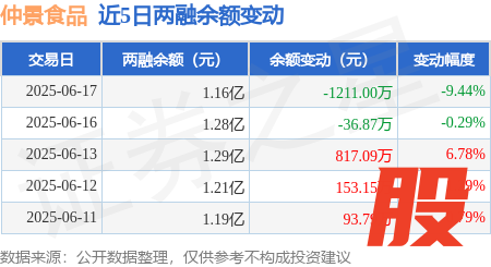 本站消息,6月17日,仲景食品(300908)融资买入141.11万元,融资偿还1352.11万元七星,融资净卖出1211.0万元,融资余额1.16亿元。